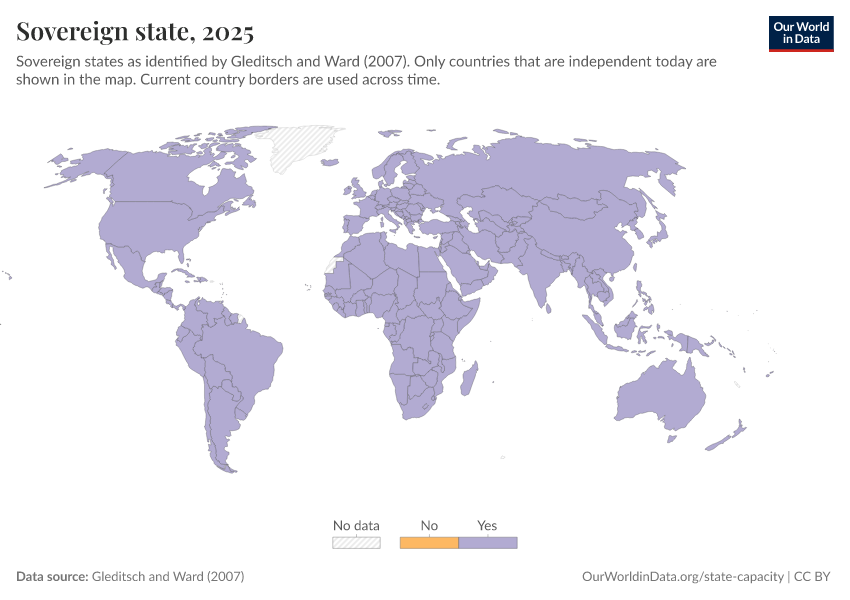 “Data Page: Sovereign state”, part of the following publication: Bastian Herre and Pablo Arriagada (2023) - “State Capacity”. Data adapted from Gleditsch and Ward. Retrieved from https://data-childlabor-ilounicef.owid.pages.dev:8789/20260304-094028/grapher/sovereign-state-gleditsch-ward.html [online resource] (archived on March 4, 2026).How to cite this data