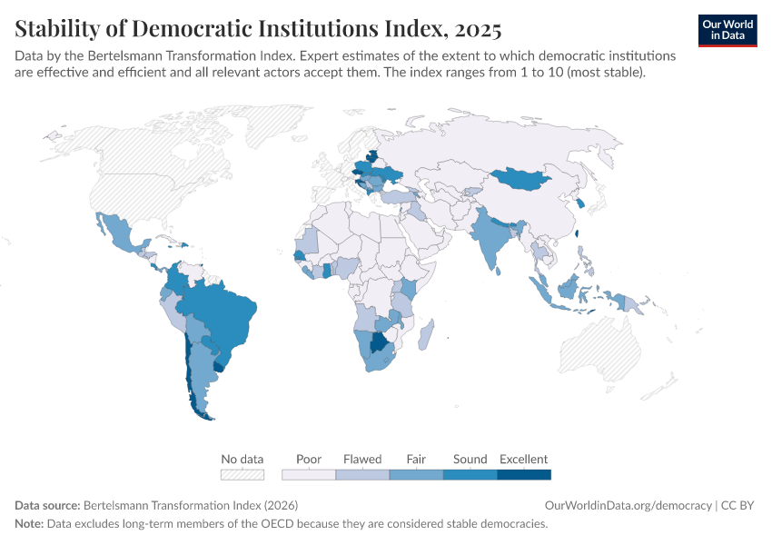 “Data Page: Stability of Democratic Institutions Index”, part of the following publication: Bastian Herre, Lucas Rodés-Guirao, and Esteban Ortiz-Ospina (2013) - “Democracy”. Data adapted from Bertelsmann Transformation Index. Retrieved from https://data-childlabor-ilounicef.owid.pages.dev:8789/20260327-184752/grapher/stability-democratic-institutions-index-bti.html [online resource] (archived on March 27, 2026).How to cite this data