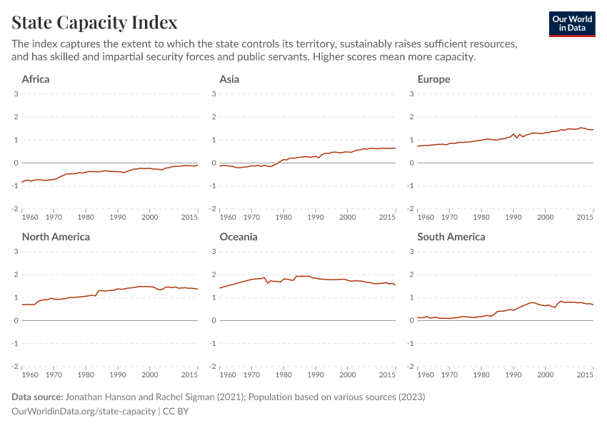 Measures state capacity by combining 21 different indicators related to three key dimensions: extractive capacity, coercive capacity, and administrative capacity. Higher values indicate greater state capacity.