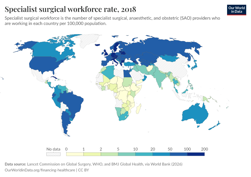 “Data Page: Specialist surgical workforce rate”. Our World in Data (2026). Data adapted from Lancet Commission on Global Surgery, WHO, and BMJ Global Health, via World Bank. Retrieved from https://data-childlabor-ilounicef.owid.pages.dev:8789/20260304-094028/grapher/surgeons-per-100000.html [online resource] (archived on March 4, 2026).How to cite this data