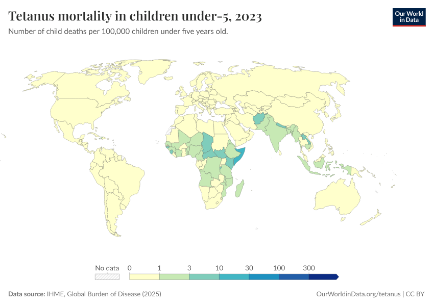 “Data Page: Tetanus mortality in children under-5”, part of the following publication: Esteban Ortiz-Ospina and Max Roser (2016) - “Global Health”. Data adapted from IHME, Global Burden of Disease. Retrieved from https://data-childlabor-ilounicef.owid.pages.dev:8789/20260323-161325/grapher/tetanus-mortality-in-children-under-5.html [online resource] (archived on March 23, 2026).How to cite this data
