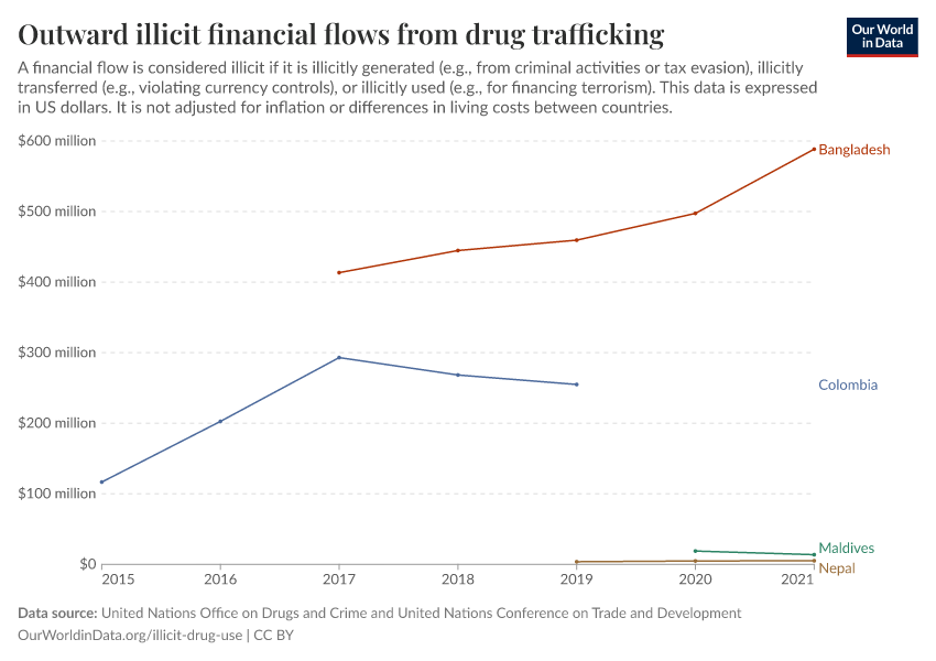 “Data Page: Outward illicit financial flows from drug trafficking”. Our World in Data (2026). Data adapted from United Nations Office on Drugs and Crime and United Nations Conference on Trade and Development. Retrieved from https://data-childlabor-ilounicef.owid.pages.dev:8789/20260304-094028/grapher/total-outward-financial-flows-from-drug-trafficking.html [online resource] (archived on March 4, 2026).How to cite this data