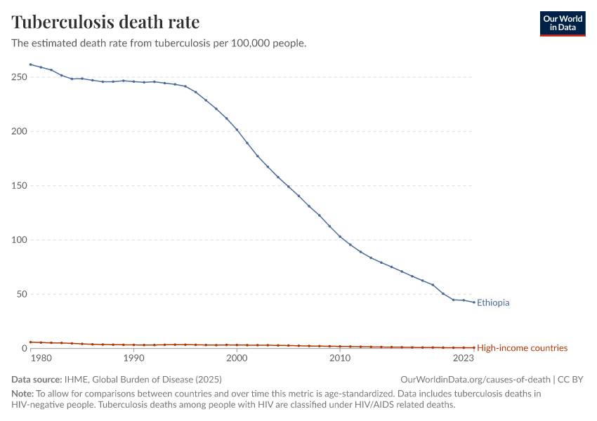 IHME, Global Burden of Disease (2025) – with major processing by Our World in Data. “Tuberculosis death rate – IHME” [dataset]. IHME, Global Burden of Disease, “Global Burden of Disease - Deaths” [original data]. Retrieved April 14, 2026 from https://data-childlabor-ilounicef.owid.pages.dev:8789/20260323-161325/grapher/tuberculosis-death-rates.html (archived on March 23, 2026).