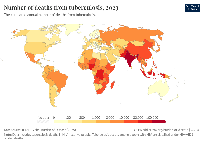 “Data Page: Number of deaths from tuberculosis”, part of the following publication: Esteban Ortiz-Ospina and Max Roser (2016) - “Global Health”. Data adapted from IHME, Global Burden of Disease. Retrieved from https://data-childlabor-ilounicef.owid.pages.dev:8789/20260323-160356/grapher/tuberculosis-deaths.html [online resource] (archived on March 23, 2026).How to cite this data