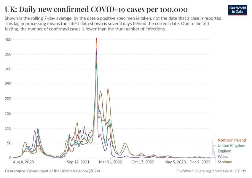 Government of the United Kingdom (2024) – with minor processing by Our World in Data. “UK: Daily new confirmed COVID-19 cases per 100,000” [dataset]. Government of the United Kingdom, “UKHSA data dashboard” [original data]. Retrieved April 14, 2026 from https://data-childlabor-ilounicef.owid.pages.dev:8789/20260304-094028/grapher/uk-daily-covid-cases-7day-average.html (archived on March 4, 2026).Download