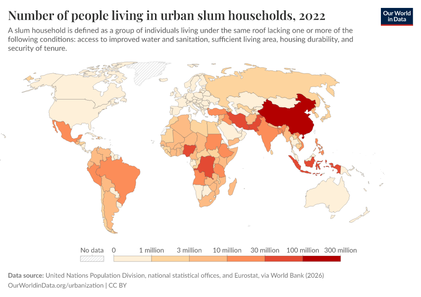 “Data Page: Number of people living in urban slum households”. Our World in Data (2026). Data adapted from United Nations Population Division, national statistical offices, and Eurostat, via World Bank. Retrieved from https://data-childlabor-ilounicef.owid.pages.dev:8789/20260304-094028/grapher/urban-pop-in-out-of-slums.html [online resource] (archived on March 4, 2026).How to cite this data