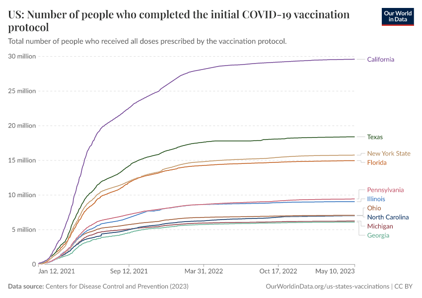 Centers for Disease Control and Prevention (2023) – processed by Our World in Data. “US: Number of people who completed the initial COVID-19 vaccination protocol” [dataset]. Centers for Disease Control and Prevention, “COVID-19, Vaccinations (United States)” [original data]. Retrieved April 14, 2026 from https://data-childlabor-ilounicef.owid.pages.dev:8789/20260304-094028/grapher/us-covid-number-fully-vaccinated.html (archived on March 4, 2026).Download