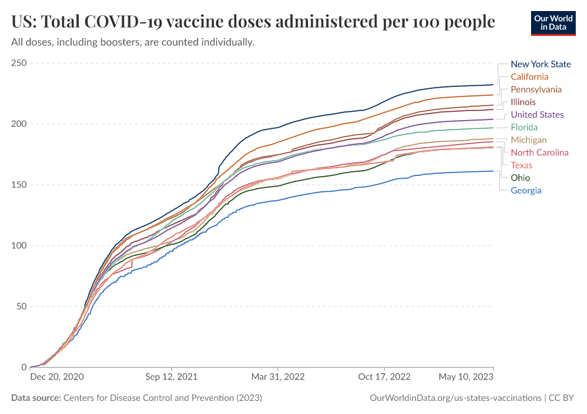 Centers for Disease Control and Prevention (2023) – processed by Our World in Data. “US: Total COVID-19 vaccine doses administered per 100 people” [dataset]. Centers for Disease Control and Prevention, “COVID-19, Vaccinations (United States)” [original data]. Retrieved April 14, 2026 from https://data-childlabor-ilounicef.owid.pages.dev:8789/20260304-094028/grapher/us-state-covid-vaccines-per-100.html (archived on March 4, 2026).Download