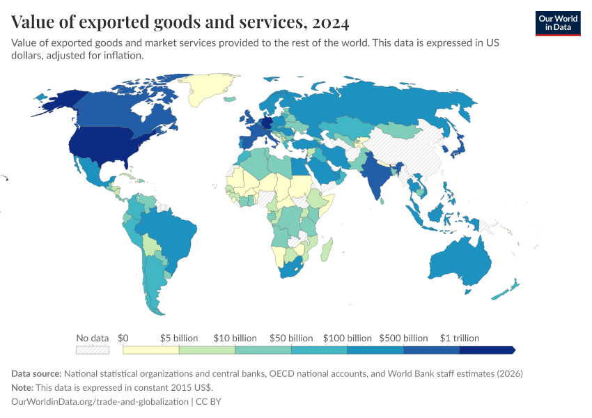 “Data Page: Value of exported goods and services”. Our World in Data (2026). Data adapted from National statistical organizations and central banks, OECD national accounts, and World Bank staff estimates. Retrieved from https://data-childlabor-ilounicef.owid.pages.dev:8789/20260304-094028/grapher/value-of-exported-goods-and-services.html [online resource] (archived on March 4, 2026).How to cite this data