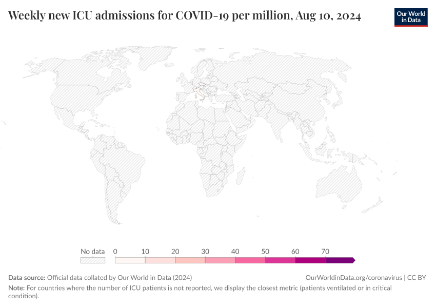 - Hospital and ICU data are sourced from official providers and collated by Our World in Data, but no new datapoints have been added since 13 August 2024.