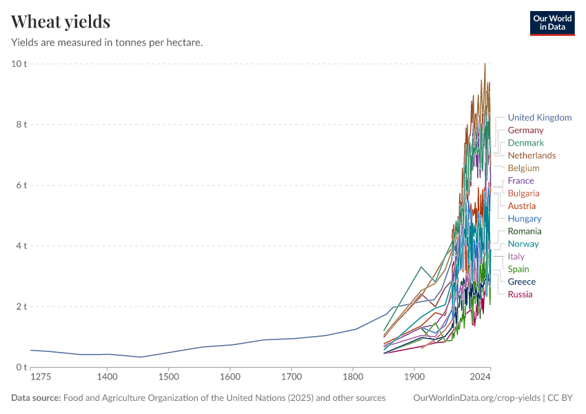 Food and Agriculture Organization of the United Nations (2025); Broadberry et al. (2015); Brassley (2000); Bayliss-Smith & Wanmali (1984) – with major processing by Our World in Data. “Wheat yields” [dataset]. Food and Agriculture Organization of the United Nations, “Production: Crops and livestock products”; Broadberry et al., “Long-term crop yields in UK”; Brassley, “Long-term crop yields in UK”; Bayliss-Smith & Wanmali, “Understanding Green Revolutions” [original data]. Retrieved April 14, 2026 from https://data-childlabor-ilounicef.owid.pages.dev:8789/20260304-110441/grapher/wheat-yields.html (archived on March 4, 2026).Download