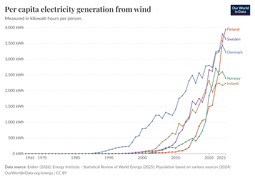 Ember (2026); Energy Institute - Statistical Review of World Energy (2025); Population based on various sources (2024) – with major processing by Our World in Data. “Electricity generation from wind power per person” [dataset]. Ember, “Yearly Electricity Data Europe”; Ember, “Yearly Electricity Data”; Energy Institute, “Statistical Review of World Energy”; Various sources, “Population” [original data]. Retrieved April 14, 2026 from https://data-childlabor-ilounicef.owid.pages.dev:8789/20260402-173937/grapher/wind-electricity-per-capita.html (archived on April 2, 2026).Download