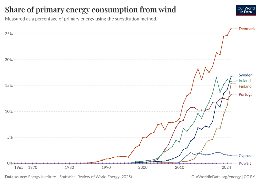 Energy Institute - Statistical Review of World Energy (2025) – with major processing by Our World in Data. “Share of primary energy consumption that comes from wind power – Using the substitution method” [dataset]. Energy Institute, “Statistical Review of World Energy” [original data]. Retrieved April 14, 2026 from https://data-childlabor-ilounicef.owid.pages.dev:8789/20260304-094028/grapher/wind-share-energy.html (archived on March 4, 2026).Download