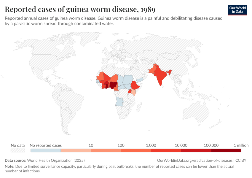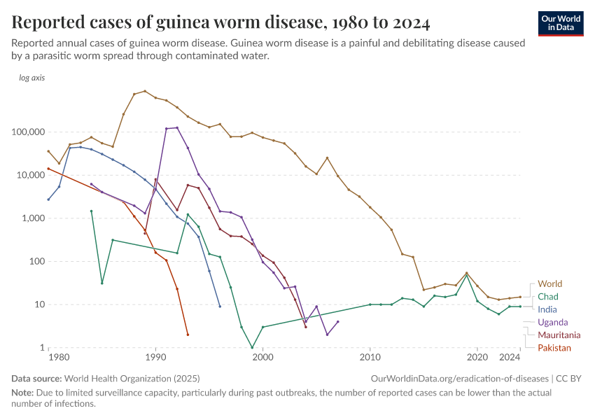 Saloni Dattani and Fiona Spooner (2022) - “Guinea worm disease is close to being eradicated – how was this progress achieved?” Published online at OurWorldinData.org. Retrieved from: 'https://data-childlabor-ilounicef.owid.pages.dev:8789/20260304-094028/guinea-worm-path-eradication.html' [Online Resource] (archived on March 4, 2026).BibTeX citation