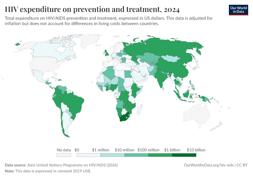 According to the Global Burden of Disease study, nearly a million people die yearly from HIV/AIDS. To put this into context: this is just over 50% higher than the number of deaths from malaria. It's one of the largest killers globally, but for some countries – particularly across Sub-Saharan Africa, it's the leading cause of death.