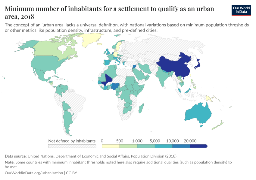 In the table, we highlight the varied definitions across a selection of countries. The UN World Urbanization Prospects database also provides the full downloadable list of statistical definitions for each country.