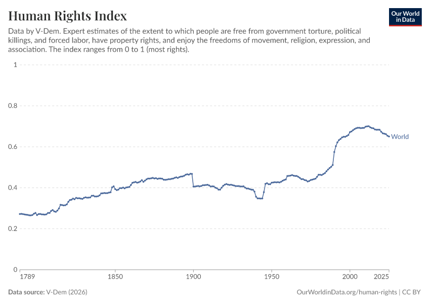 On this page, you can find data, visualizations, and writing on how the protection of human rights has changed over time, how it differs across countries, and how it varies between people of different genders, sexualities, and ethnicities.