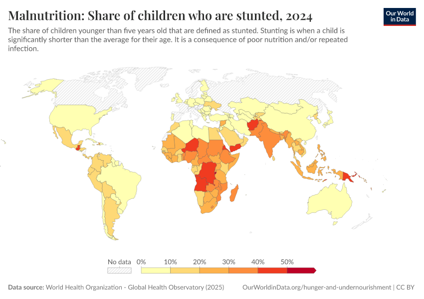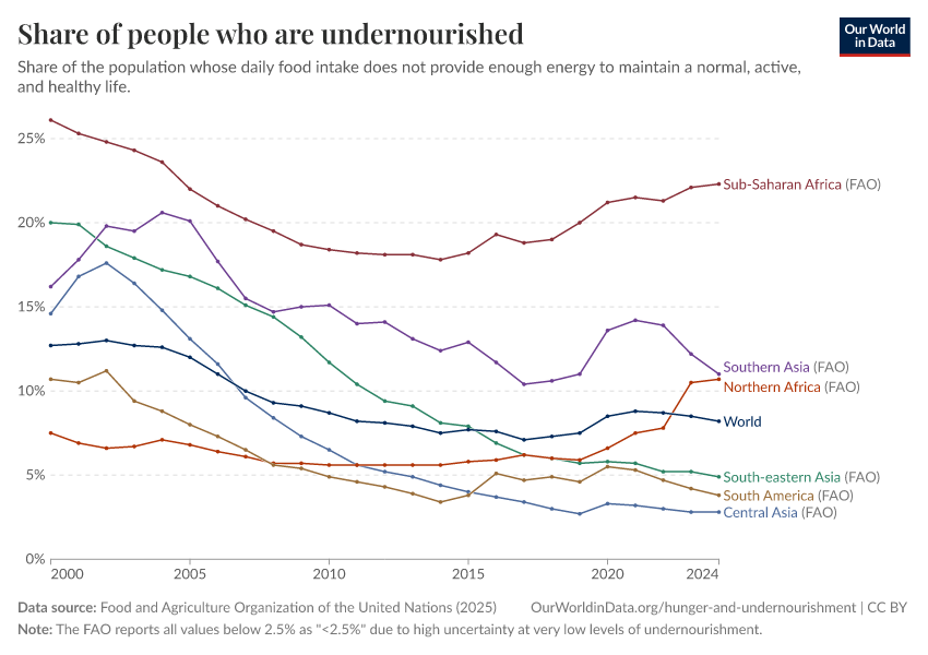 Hannah Ritchie, Pablo Rosado, and Max Roser (2023) - “Hunger and Undernourishment” Published online at OurWorldinData.org. Retrieved from: 'https://data-childlabor-ilounicef.owid.pages.dev/hunger-and-undernourishment' [Online Resource]BibTeX citation