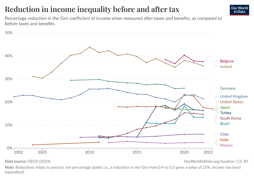 Joe Hasell (2023) - “Income inequality before and after taxes: how much do countries redistribute income?” Published online at OurWorldinData.org. Retrieved from: 'https://data-childlabor-ilounicef.owid.pages.dev:8789/20260402-163007/income-inequality-before-and-after-taxes.html' [Online Resource] (archived on April 2, 2026).BibTeX citation