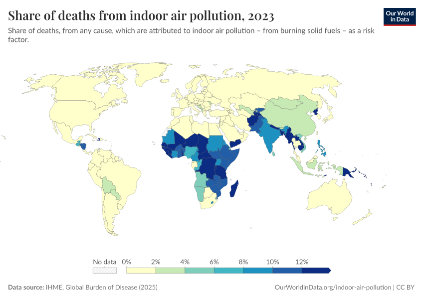 In the map here, we see the share of annual deaths attributed to indoor air pollution across the world.