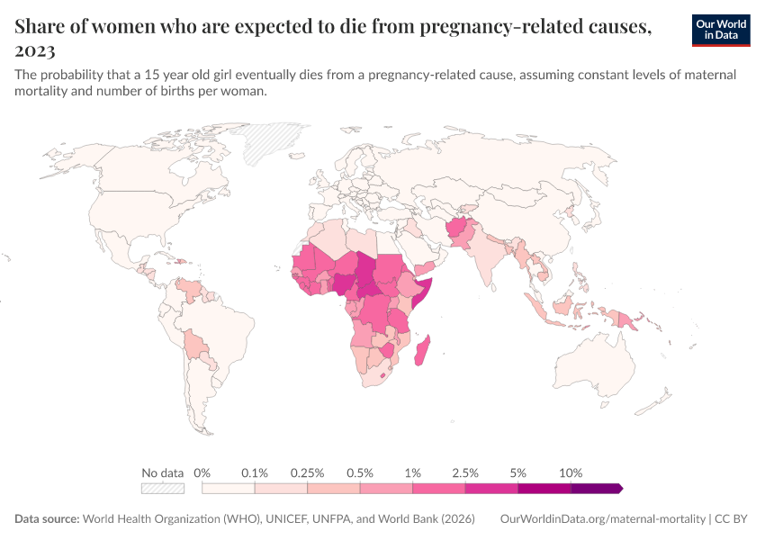 In the chart, we see estimates of the share of women who would die from maternal causes in their lifetime.