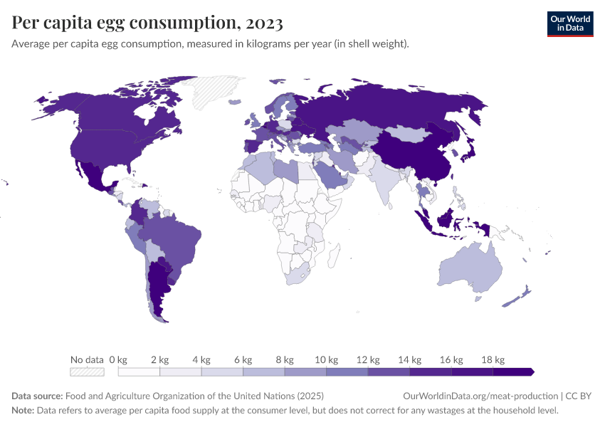 In the chart, we see a global map of per capita meat (excluding seafood and fish) consumption, measured in kilograms per person per year. These trends can also be viewed as a time series in the "Chart" tab. Globally, there has been an increase in average per capita meat consumption over the years. This rise in per capita consumption indicates that total meat production has grown at a rate faster than population growth.