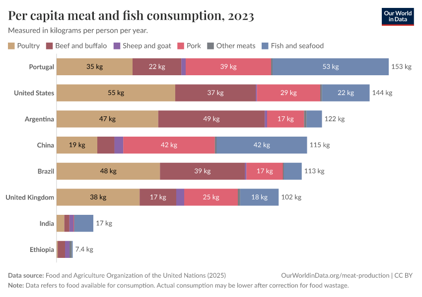 Seafood production – fish and seafood is another key source of protein and nutrition for populations across the world. How much fish do people eat, and what are the environmental impacts?