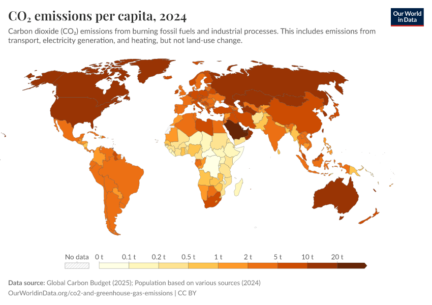 We can calculate the contribution of the average citizen of each country by dividing its total emissions by its population. This gives us CO2 emissions per capita. In the visualization we see the differences in per capita emissions across the world.