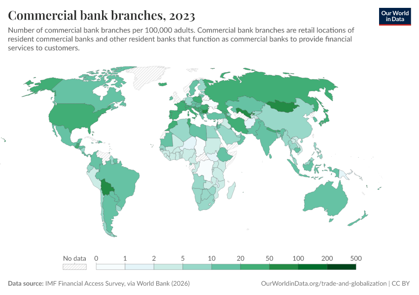 Data for this indicator is shown in the interactive visualizations, with data on commercial bank branches in the first chart and data on ATMs in the second chart.