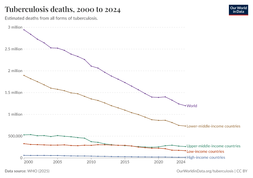 Hannah Ritchie and Fiona Spooner (2025) - “The end of tuberculosis that wasn’t” Published online at OurWorldinData.org. Retrieved from: 'https://data-childlabor-ilounicef.owid.pages.dev:8789/20260323-160356/the-end-of-tuberculosis-that-wasnt.html' [Online Resource] (archived on March 23, 2026).BibTeX citation