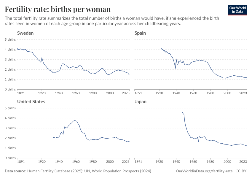 Saloni Dattani and Lucas Rodés-Guirao (2025) - “Why the total fertility rate doesn’t necessarily tell us the number of births women eventually have” Published online at OurWorldinData.org. Retrieved from: 'https://data-childlabor-ilounicef.owid.pages.dev:8789/20260402-163007/total-fertility-rate-births-per-woman.html' [Online Resource] (archived on April 2, 2026).BibTeX citation