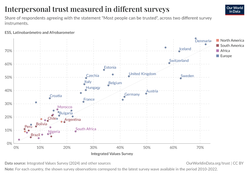 The following scatter plot compares cross-country estimates of trust, using data from two different surveys for each country. By comparing the estimates from different surveys, we can check if similar but different measurement methods provide a consistent and robust picture of interpersonal trust.