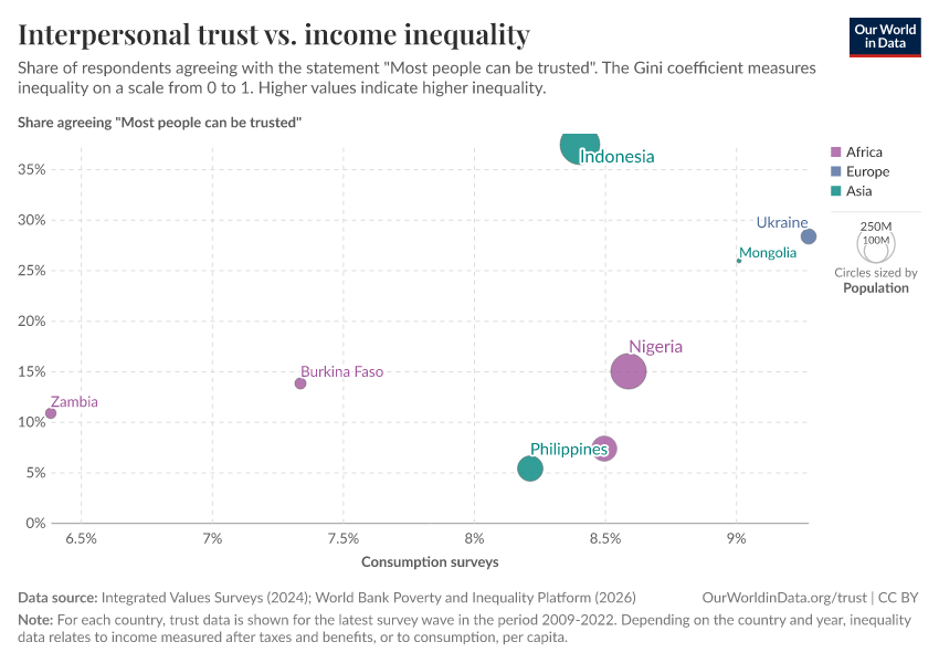 Each dot on this scatter-plot corresponds to a different country, with colors representing different world regions and dot sizes representing the size of the population. A Gini index of 0 would represent perfect equality, so the observed negative correlation in this graph shows that higher inequality is associated with lower trust.