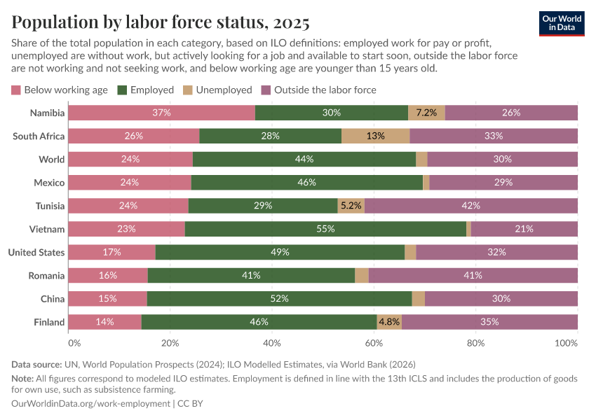 For international comparisons, the most widely used cross-country series are produced by the International Labour Organization (ILO). In its harmonized series, the working-age population is typically defined as everyone aged 15 and older, with no upper age limit, and most of our charts on this page follow this definition.2