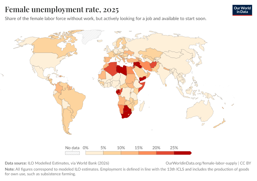 In the map, we focus on overall unemployment rates, but the picture can look very different for specific groups. In many countries, women have higher unemployment rates, and young people are more likely to be unemployed.