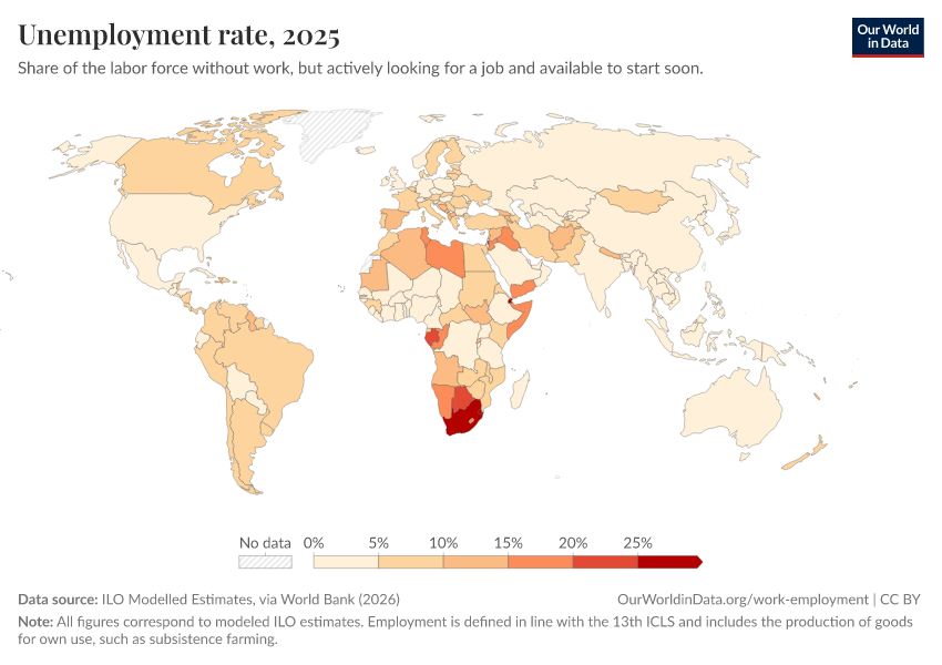 This is something that often surprises people: some poor countries have similar or even lower unemployment rates than rich countries. For example, Burkina Faso and Australia have roughly the same unemployment rate (around 3.5% and 4 % in 2025).